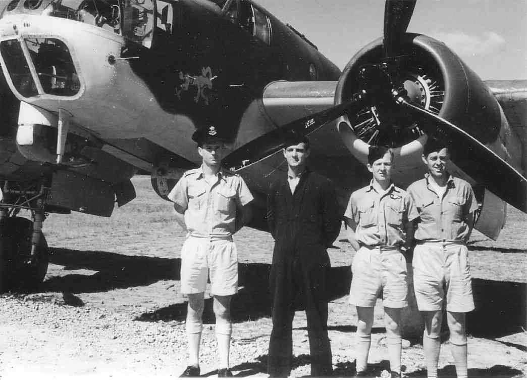 L-R: Flying Officer John Clifton Davis (pilot), SGT George Collins (WAG), SGT William Thomas Brain (WAG) and Flight Sergeant Geoffrey Raymond Emmett (observer).
